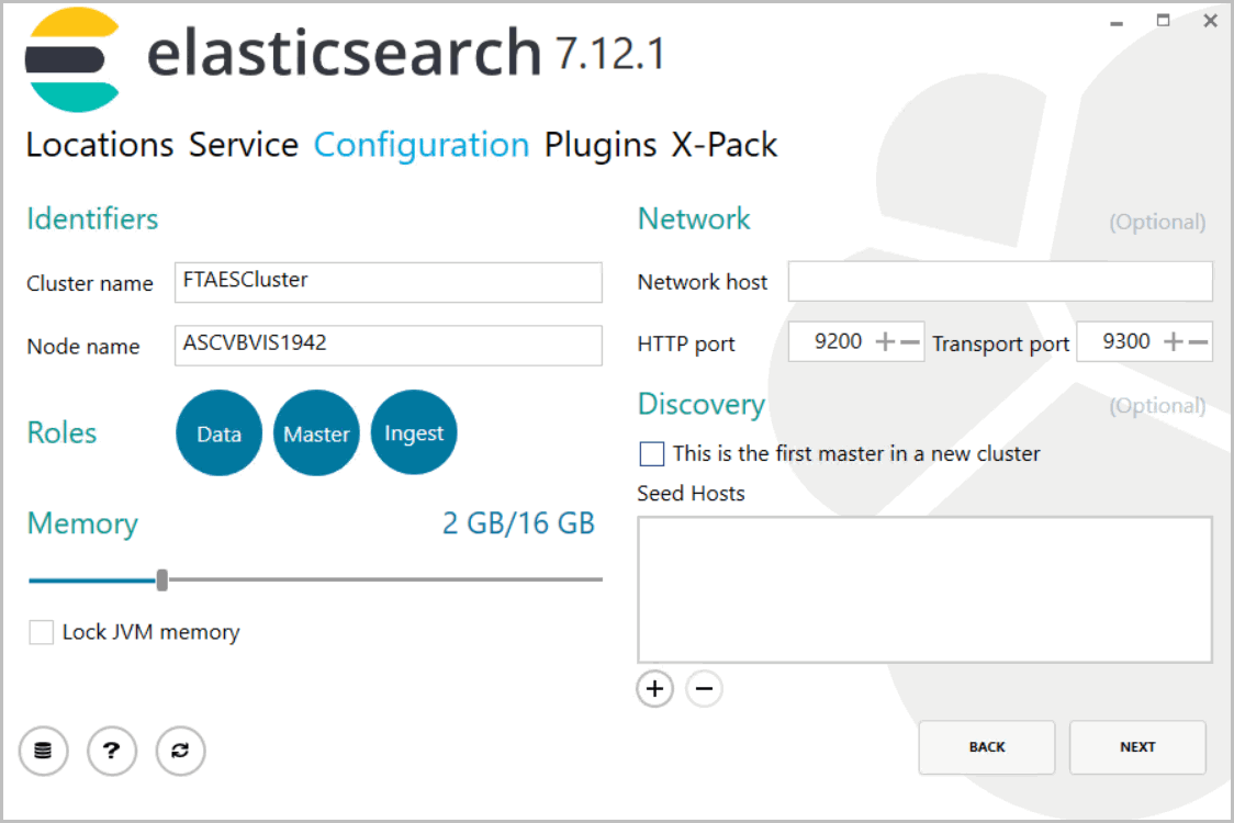 - The 'Locations' page displays. Use default settings and click [NEXT].Elasticsearch Installation Directory