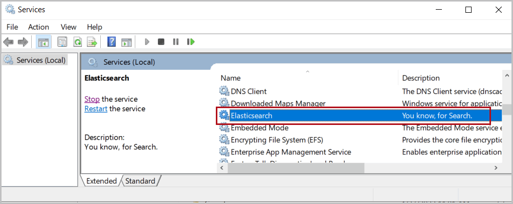 NOTE:To access the Elasticsearch installed on other machine in case of multi-node configuration, modify the configuration file. Refer to Appendix A, “Elasticsearch Remote Connection Configurations” section for steps to modify the configuration file. - Open the Windows Service management console to verify that Elasticsearch is successfully installed. Ensure that the Elasticsearch service is running.Elasticsearch Service