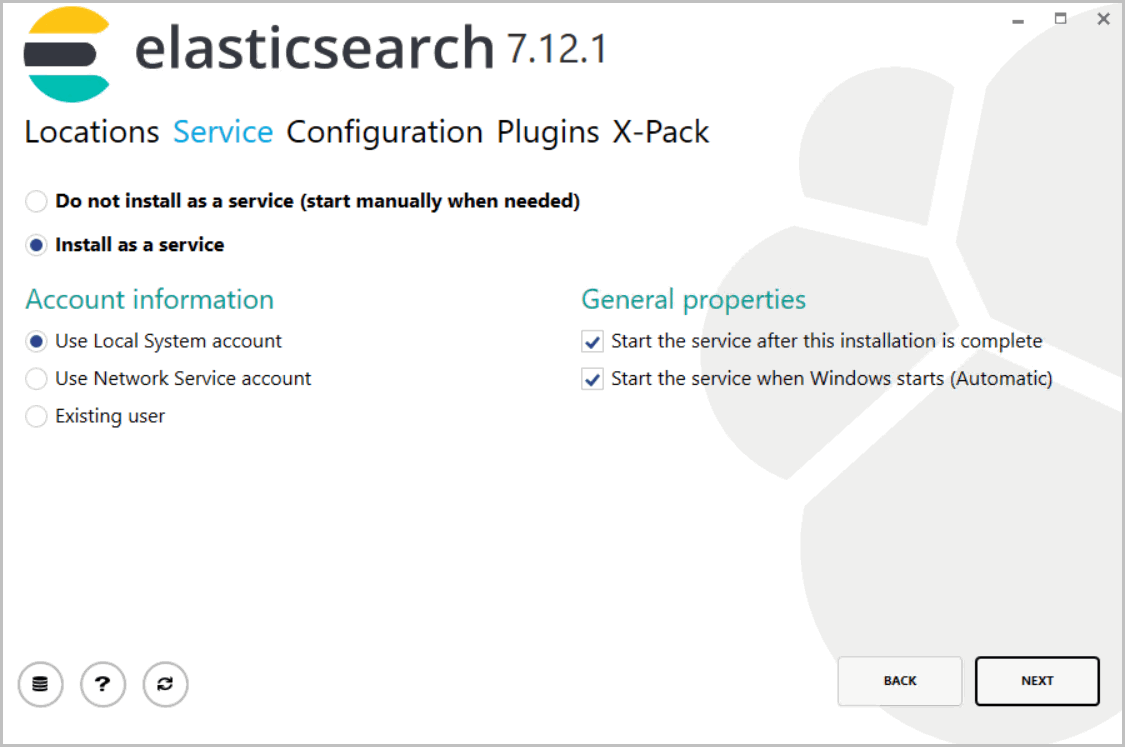 NOTE:Select [Use a custom installation directory] and define a folder on a non-OS drive for easy restore purposes. - The 'Service' page displays. Use default settings and click [NEXT].Elasticsearch