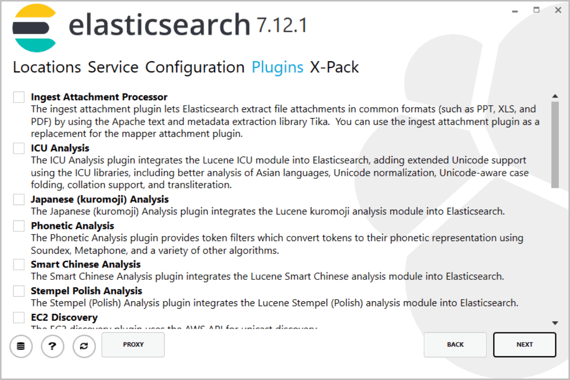 - The ‘Plugins’ page displays. Leave these configuration plugins blank and click [NEXT].Elasticsearch Plugins