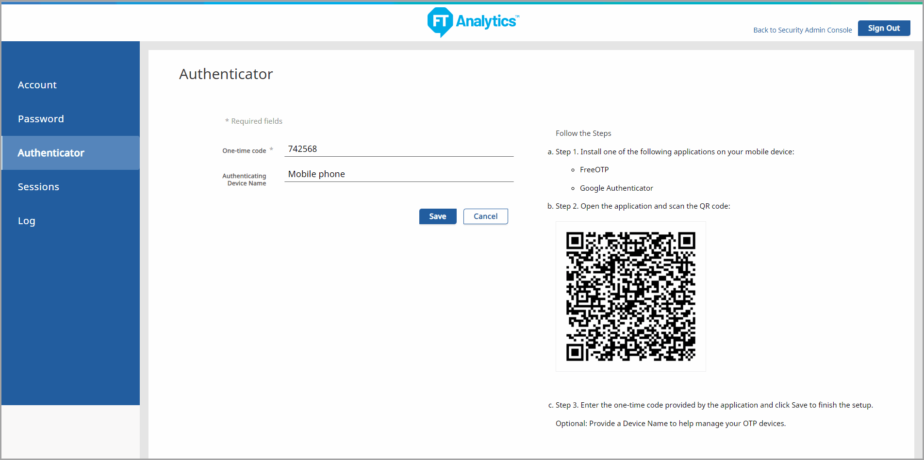 The Authenticator menu item allows the user to set up OTP if they desire. This will only show up if OTP is a valid authentication mechanism for your realm. Users are given directions to install FreeOTP or Google Authenticator on their mobile device to be their OTP generator. The QR code the user see in the screenshot can be scanned into the FreeOTP or Google Authenticator mobile application for nice and easy setup.