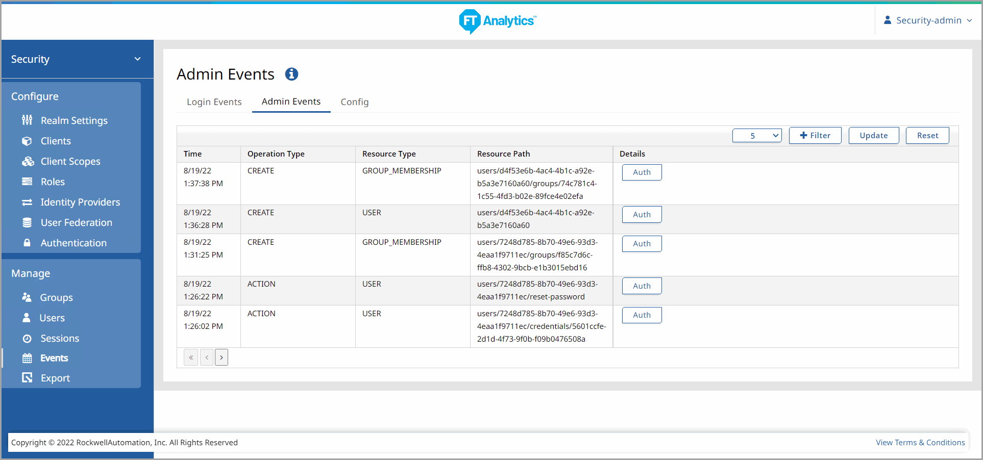 Select the Admin Events tab to view the saved Admin events for the realm. The events shown here are specific to the Admin account. For example, realm creation. The Admin Events list provides the following information about the Events: