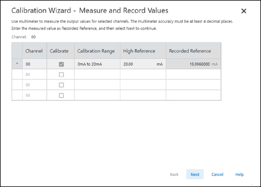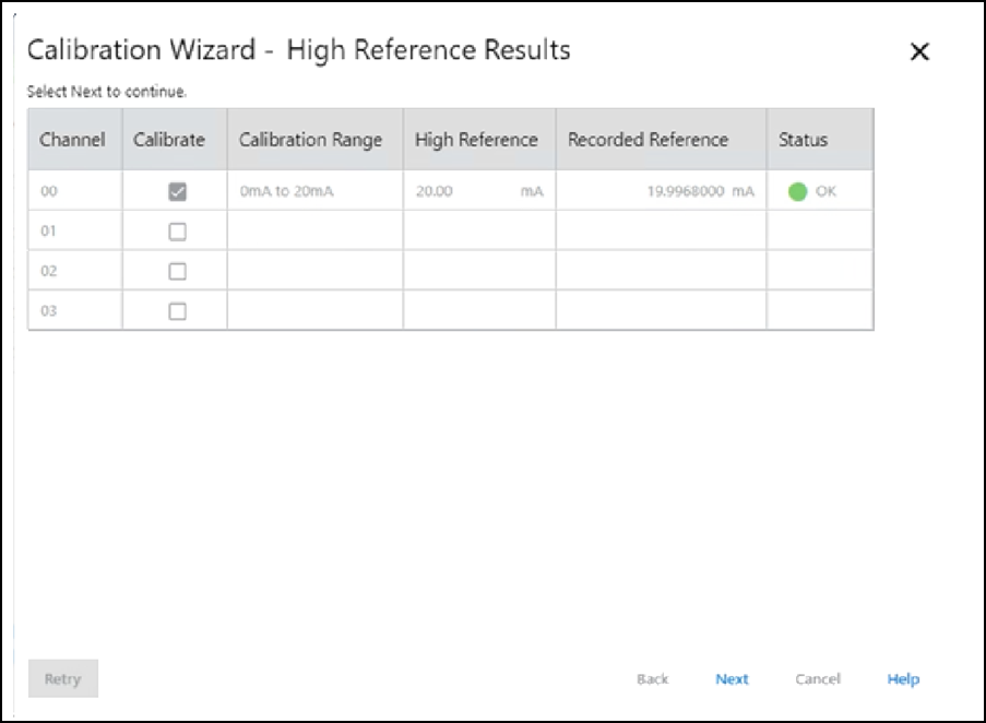 - Protokollieren Sie den gemessenen Wert in der Spalte „Recorded Reference“ (Erfasste Referenz) und klicken Sie auf „Next“ (Weiter).Das Dialogfeld „High Reference Results“ (Ergebnisse hohe Referenz) wird angezeigt und gibt den Status des kalibrierten Kanals an.
