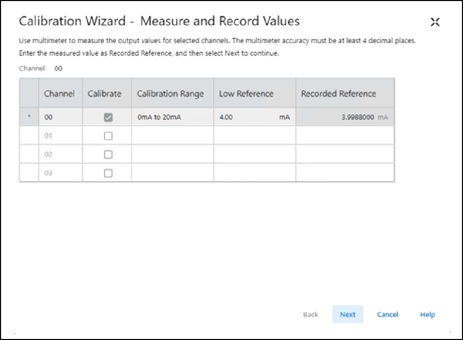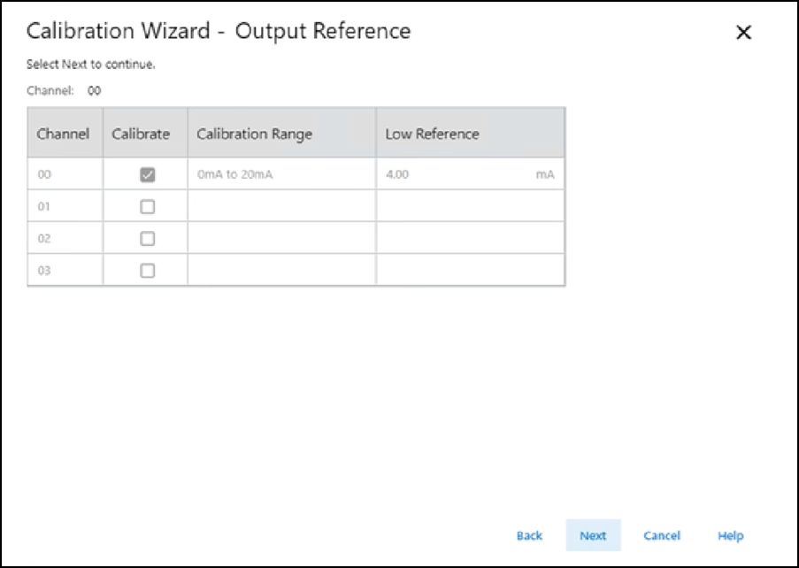 - Wenn das Dialogfeld „Output Reference“ (Ausgangsreferenz) mit dem zu kalibrierenden Kanal für die niedrige Referenz angezeigt wird, klicken Sie auf „Next“ (Weiter).