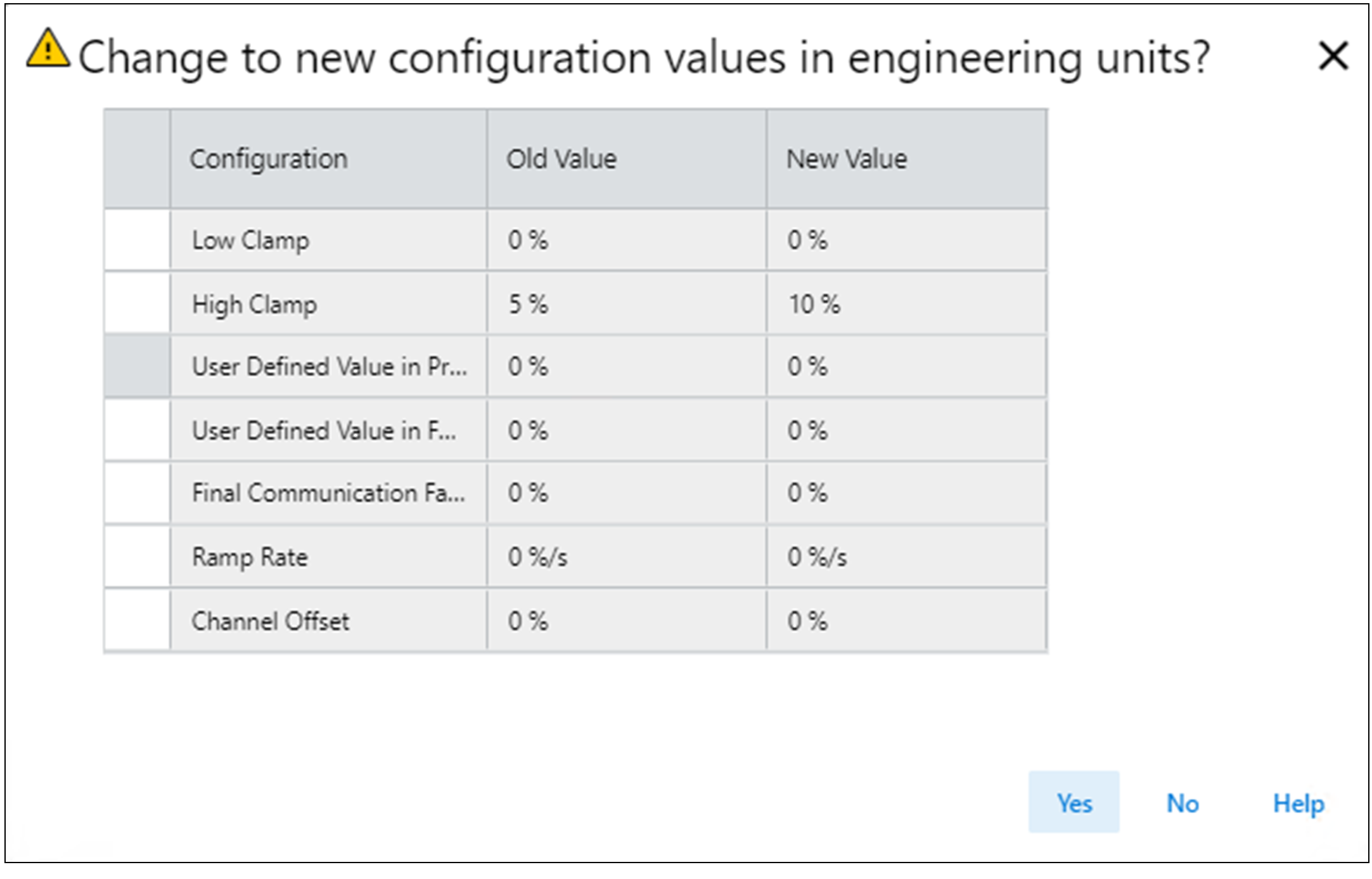 - Wenn Sie „No“ (Nein) auswählen, um die Änderung abzubrechen, werden die alten Werte beibehalten. Sie können die Neuberechnung der Einheiten entweder erneut auswählen oder die Konfigurationen manuell auf der Grundlage der neuen Skalierung ändern.