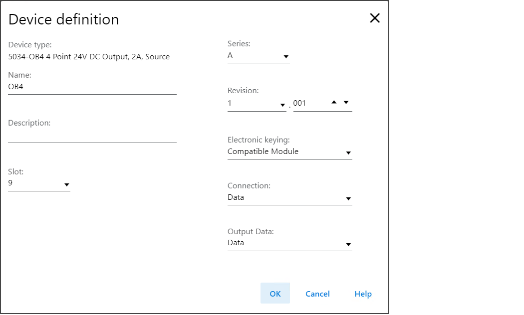 Slot (Steckplatz) | Geben Sie die Steckplatznummer des Geräts an. Je nach Plattform sind nur Steckplätze zwischen 1 und der maximalen Anzahl der E/A-Geräte gültig. Beim Erstellen des Geräts wird die Steckplatznummer standardmäßig auf die erste verfügbare Steckplatzposition gesetzt. Wenn die Steuerung in eine Steuerung geändert wird, die eine geringere maximale E/A-Anzahl unterstützt, ist der aktuelle Steckplatzwert möglicherweise nicht mehr gültig. | 1 bis 32 |
