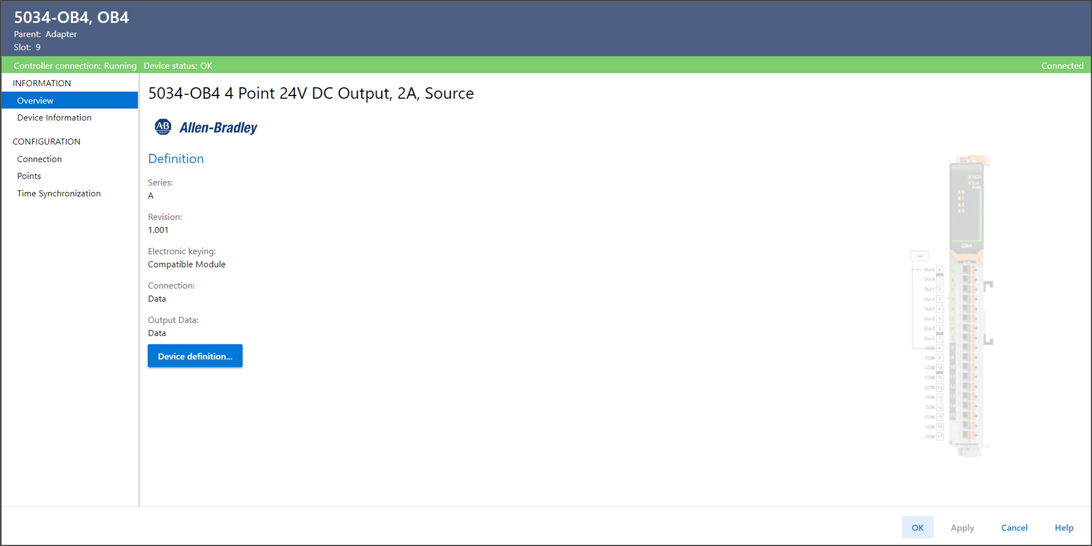 In der Übersicht können Sie die Definition eines Geräts anzeigen, einschließlich Gerätetyp, Version, elektronischer Codierung, Verbindung und anderer gerätespezifischer Werte.
