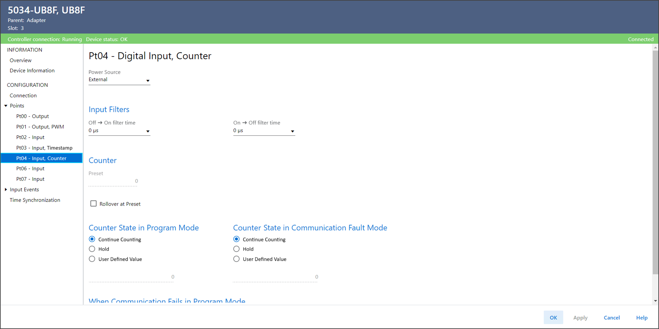 Verwenden Sie „Ptxx – Digital Input, Counter“ (Ptxx – Digitaleingang, Zähler), um die Punkte für das Gerät anzuzeigen oder zu konfigurieren.