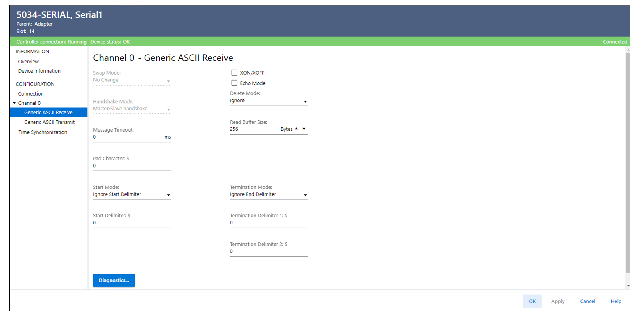 Diagnostics (Diagnosefunktionen) | Wenn der Steuerungsstatus online ist, öffnen Sie das Dialogfeld „Diagnostics“ (Diagnose), um die Diagnosezähler für die Leistungs- und Fehlerverwaltung mit der generischen ASCII-Kommunikation anzuzeigen. | – |