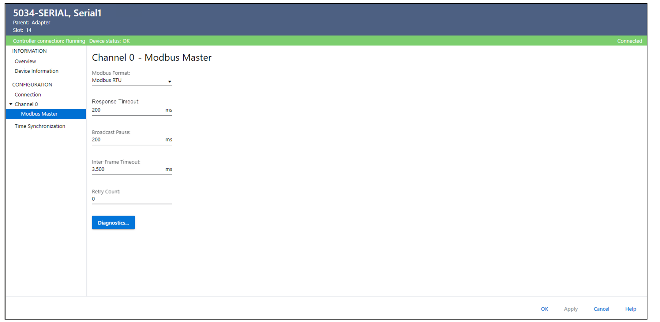 Wählen Sie „Diagnostics“ (Diagnose) aus, um die Diagnoseinformationen des Modbus-Master-Kanals anzuzeigen.