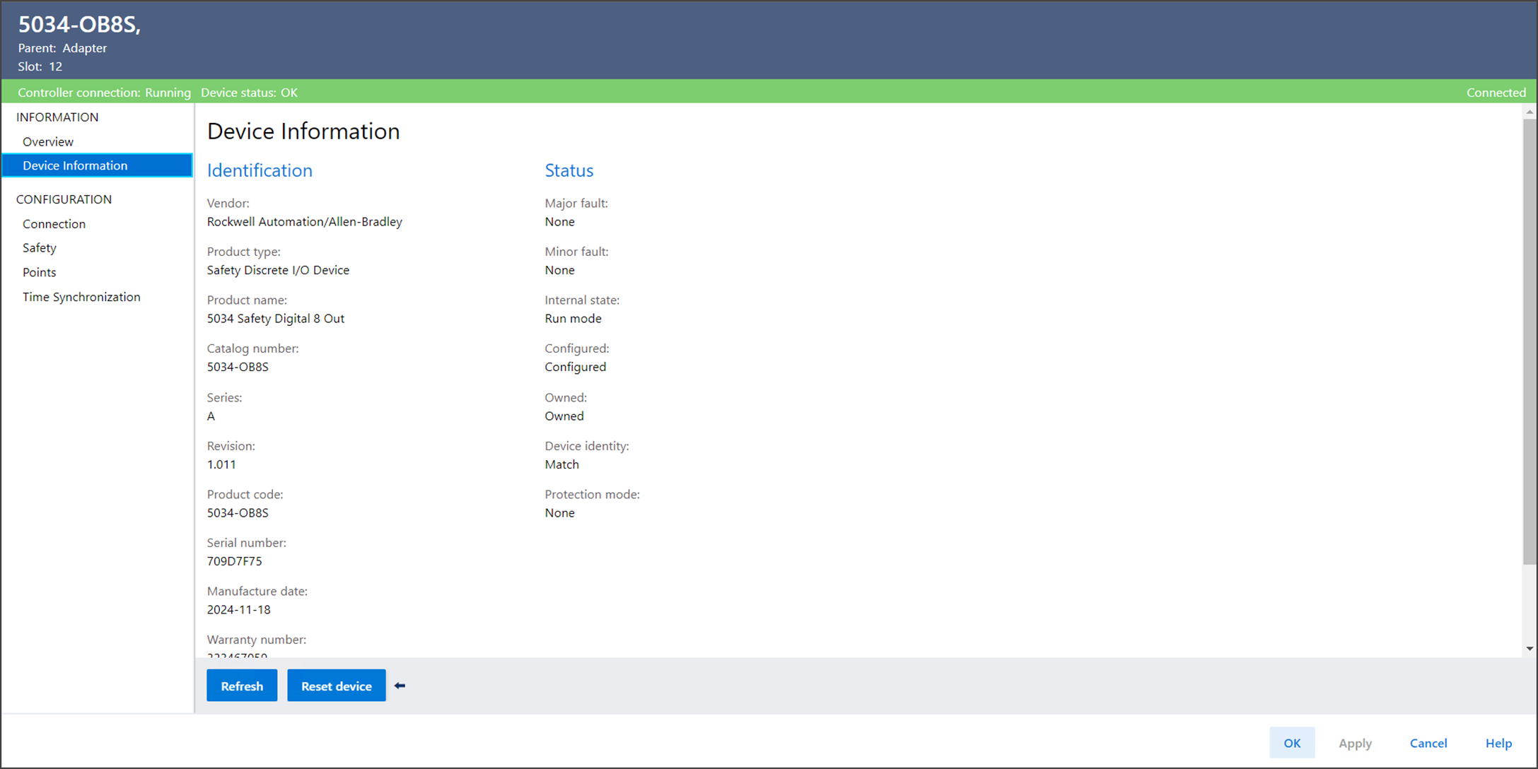 Nutzen Sie die Ansicht „Device Information“ (Geräteinformationen), um Geräte- und Statusinformationen anzuzeigen, wenn das Gerät online ist.