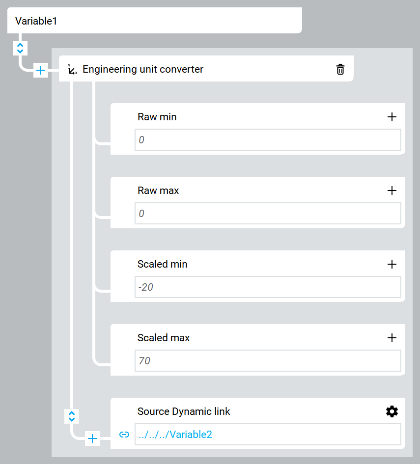 For example, the engineering unit converter can transform values from 0 to 65.535 supplied by a temperature sensor into corresponding values on a scale from -20 to +70. The input of an engineering unit converter is generally a dynamic link to an imported tag.
