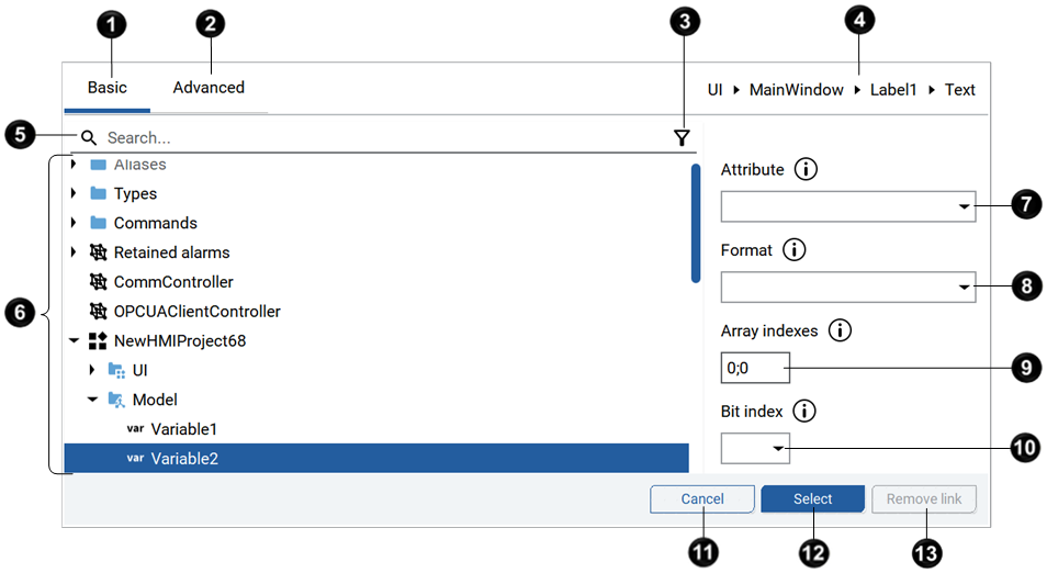 ![]() | Basic | Display the project nodes that you can use to create a dynamic link. This tab is disabled for complex dynamic links. |