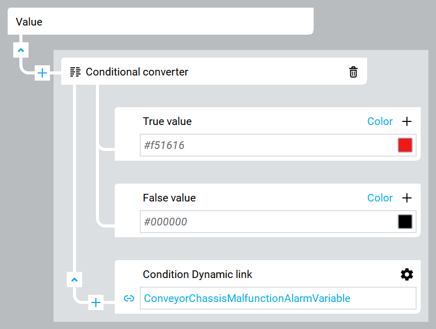 - Color. Select or enter the Hex value for the color, or create a complex dynamic link with a converter to hexadecimal color values. For example: