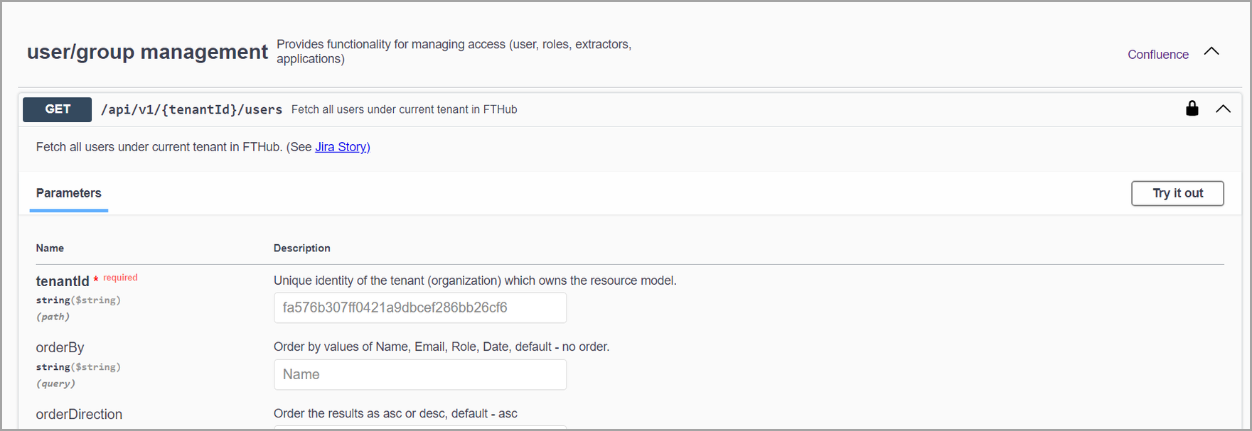 - Select the API that you want to test and clickTry it out. Here is an example for the Get request.Sample Get request