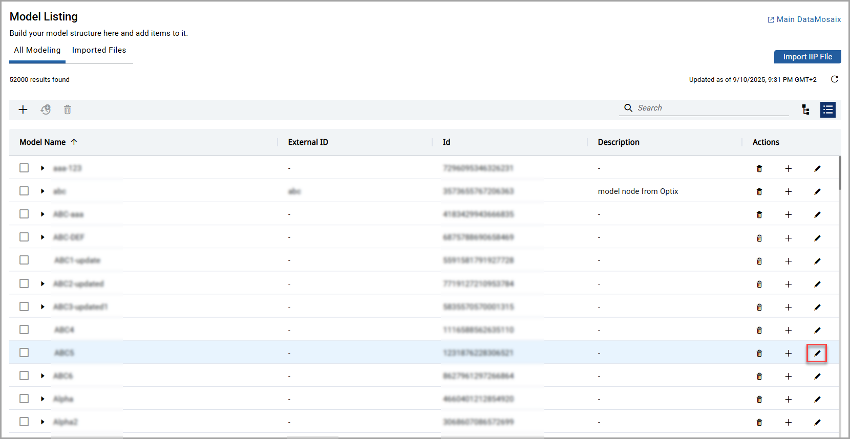 - On the Management console, select theModelingtab.By default,All Modelingtab is selected and theModel Listingpage is displayed with the available assets.Model Listing