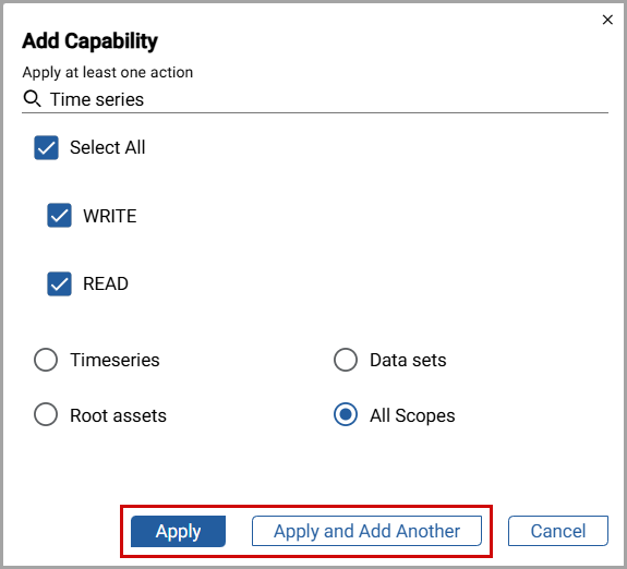 - ClickApplyto apply the changes to the group. Or,ClickApply and Add Anotherto apply the changes to the group and add another capability.Add Capability - TimeseriesAdd Capability - All ScopesAfter applying changes, theCapability Group Detailpage displays the newly created capability as a tile with the capability name, number of actions applied, and associated datasets (If any).