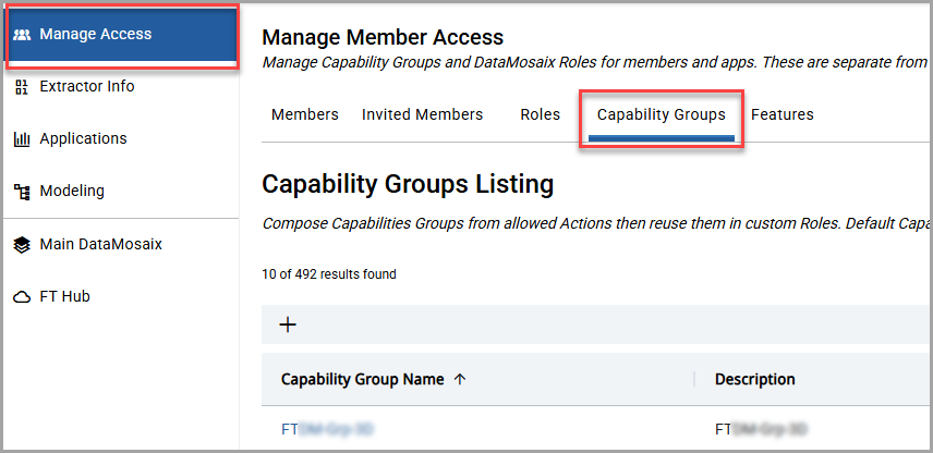 :- Navigate toManage Access>Capability Groups.Click Capability GroupsTheCapability Groups Listingpage is displayed with the capability groups associated with the selected organization.