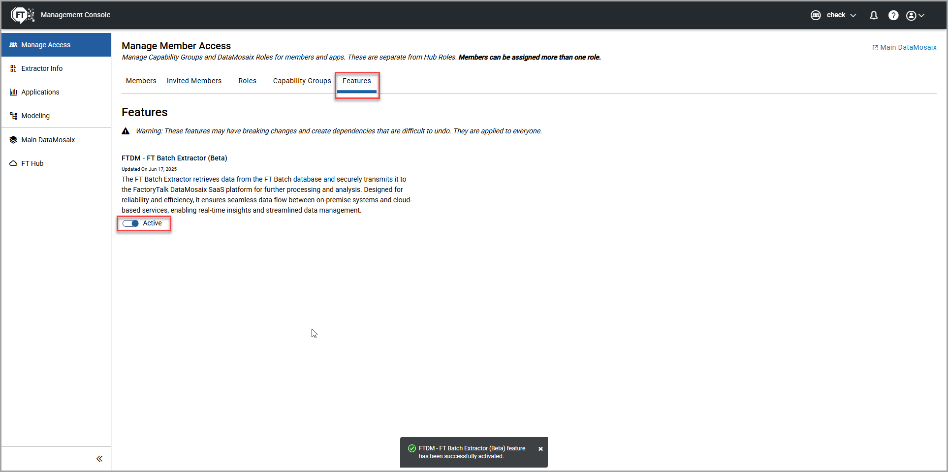 - To enable a feature, toggle the switch toActive.Activate FeatureYou will be notified that the selected feature has been successfully activated.