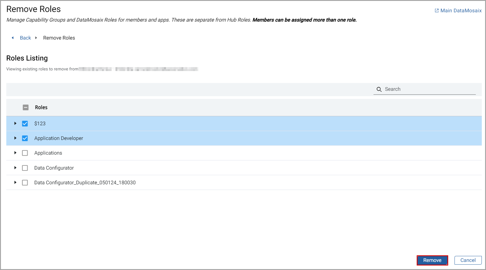 TheRemove Rolespage displays the assigned roles.NOTE:Click the [] icon to expand the role and view its capabilities. Click the icon again to collapse it.
