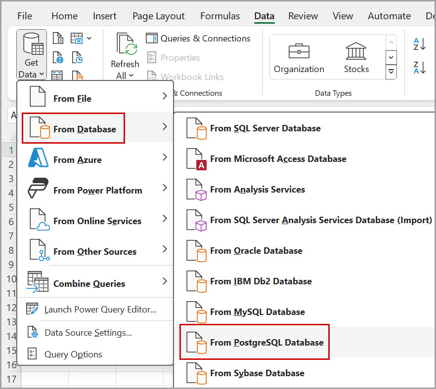 - Navigate toGet Data>From Database>From PostgreSQL Database.Select PostgreSQL Database