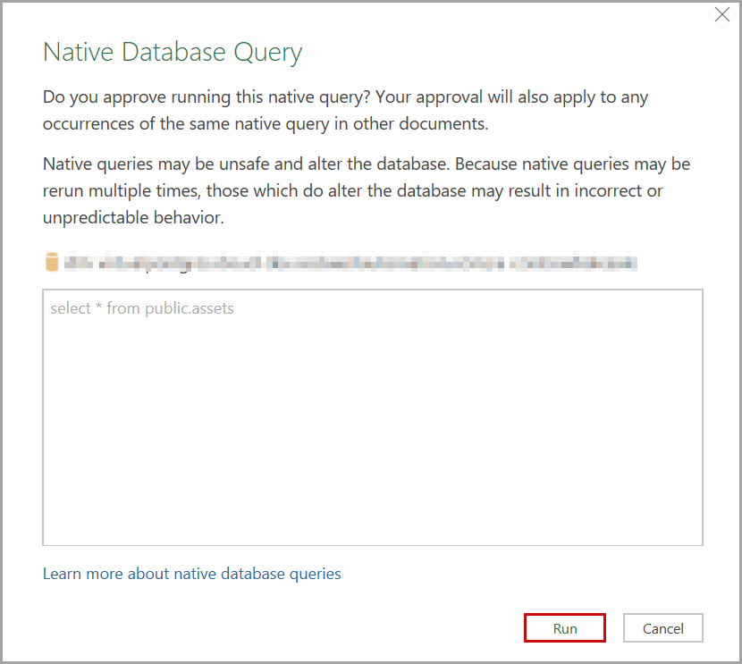 - In theNative Database Querydialog box, clickRun.Native Database Query DialogBased on the query, the data will be populated.Final Output