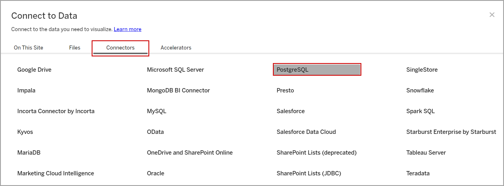 - In theConnect to Datadialog box, clickConnectors>PostgreSQL.Select PostgreSQLThePostgreSQLdialog box is displayed.