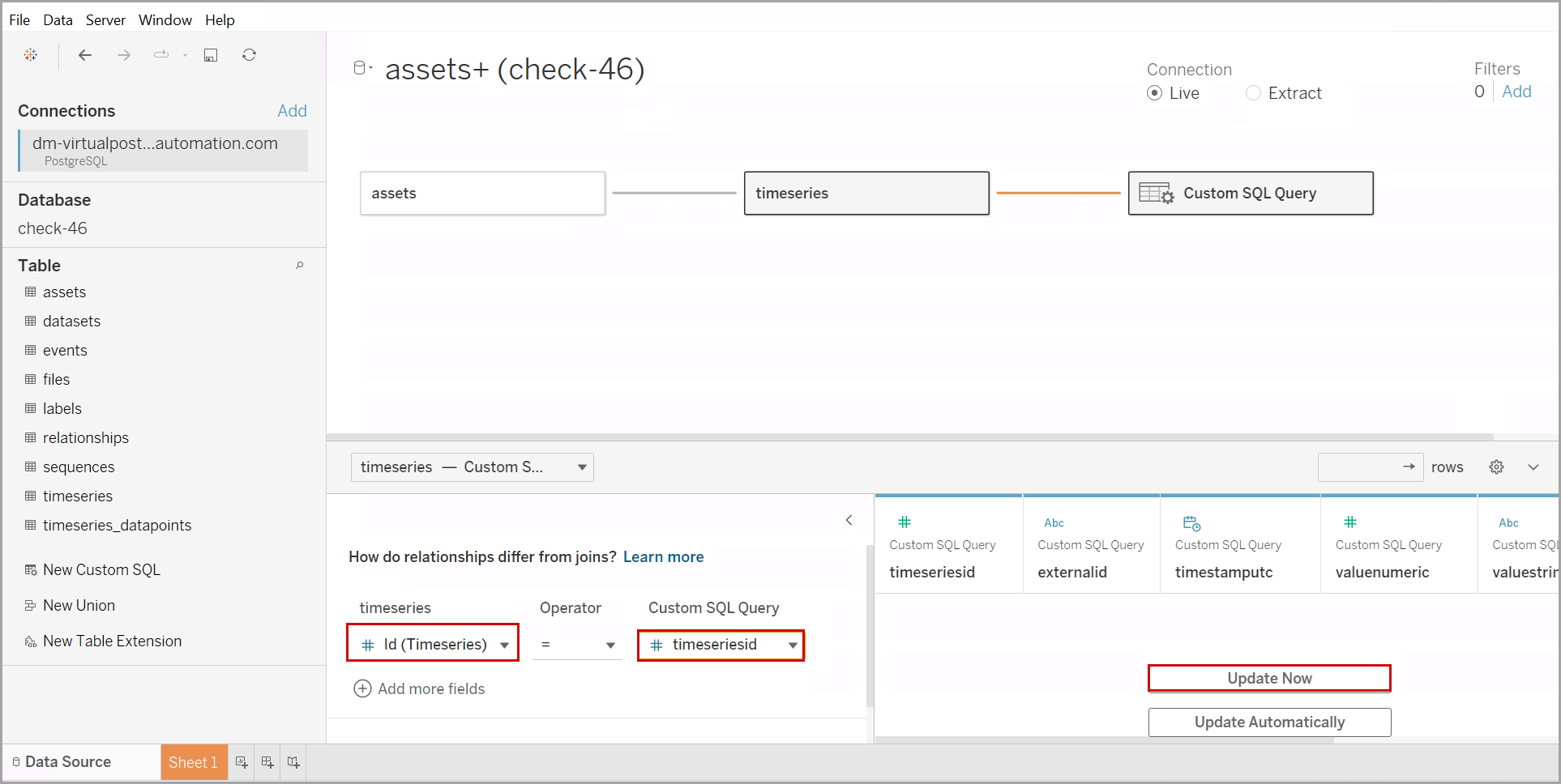 - Provide the following custom SQL query.select * from public.timeseries_datapoints where timeseriesid =IMPORTANT: It is recommended to always specify the table with thepublic.nomenclature when writing custom queries. For example, to query fromtimeseriestable, useselect columns from public.timeseries.