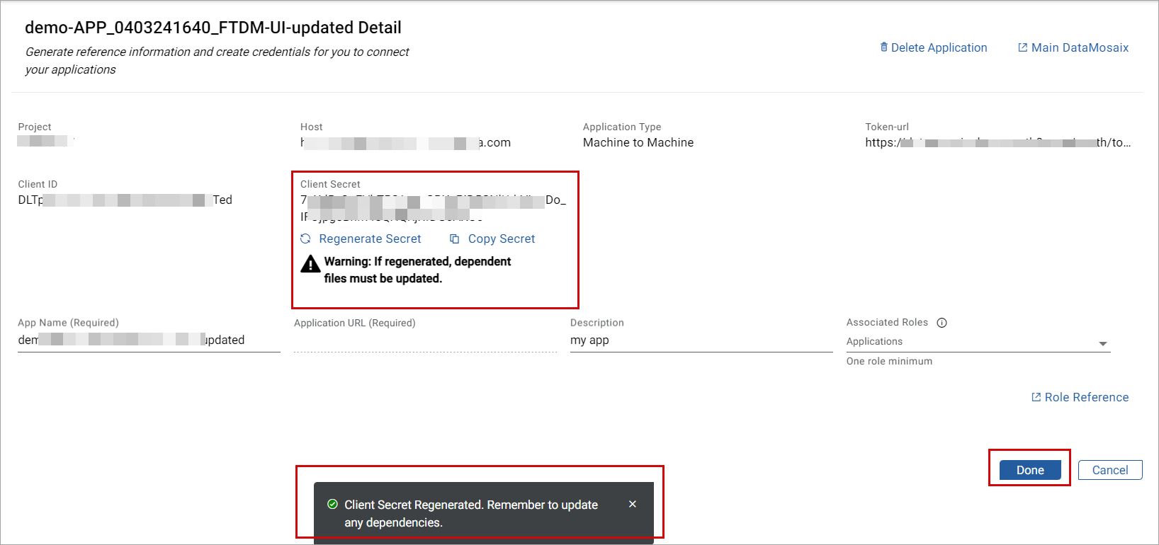 NOTE:It is important to copy the client secret and update it in the related files. Once you close this screen, this information cannot be viewed later. If you fail to save the client secret information, you will have to regenerate the secret.