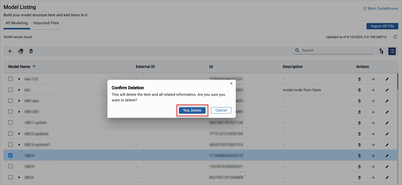 - On the Management console, select theModelingtab.By default,All Modelingtab is selected and theModel Listingpage is displayed with the available assets.Select Asset for Deletion
