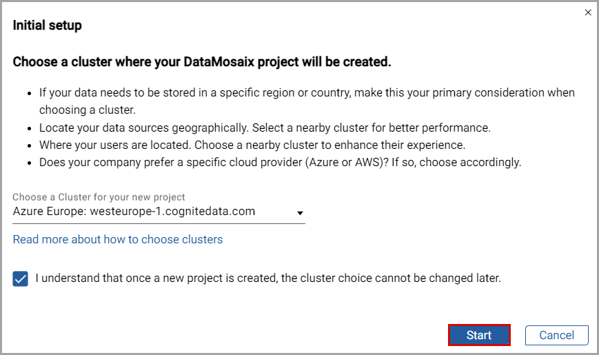 NOTE:ClickRead more about how to choose clustersto view the Create Project section in the online help documentation. - Select theI understand that once a new project is created, the cluster choice cannot be changed latercheckbox.