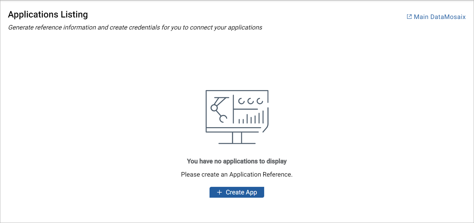 - Applications- Currently, no applications are visible. A member needs to register an application and generate credentials. These credentials must be configured before running the application for data visualization. For more information on registering applications, refer Register Application.Applications