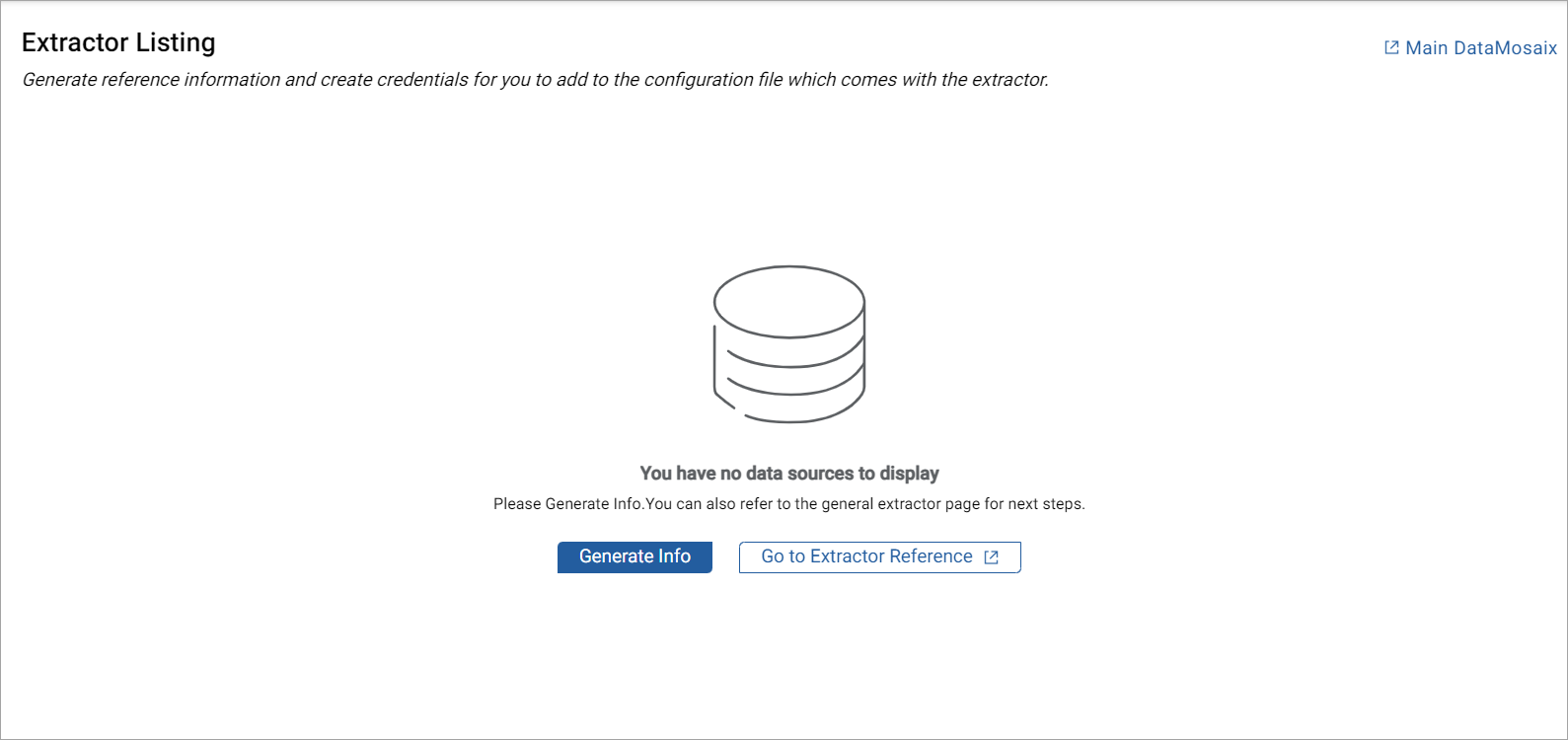 - Extractor Info- Currently, no extractors are visible. A member needs to register an extractor and generate credentials. These credentials must be added in the configuration file. For more information on registering an extractor, refer Register Extractor.Extractor Info