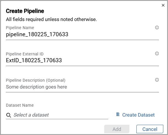 - When creating a pipeline, either select an existing dataset from theDataset Namedrop-down list or create a new dataset.If the user wants to create a new dataset, clickCreate Datasetand provide the following information: