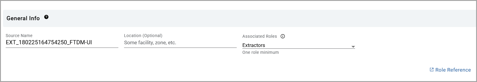 - Associated Roles: By default, theExtractorsrole is selected. Users must choose at least one role from theAssociated Rolesdrop-down list. The user can also select multiple roles from the drop-down list. Use the search bar to find a specific role. If the user wants to apply all roles to the application, select theSelect Allcheckbox.NOTE:ClickRole Referenceto view various roles and capabilities. TheAssociated Rolesdrop-down is visible and available only for Project Admin users or users within the organization with a Project Admin role assigned.General Info Section
