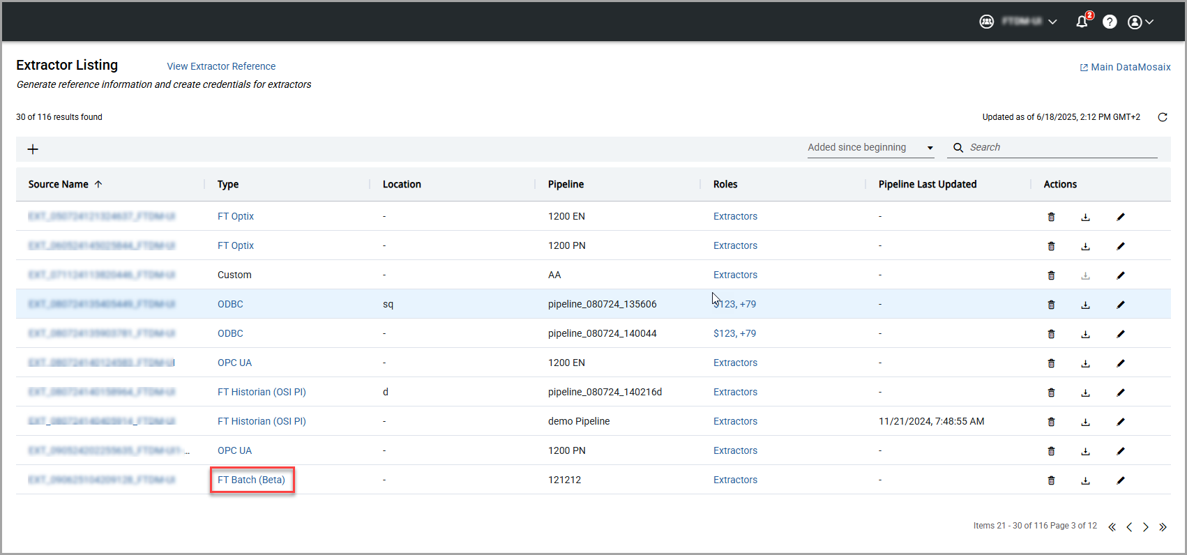 The new extractor is displayed in theExtractor Listingpage. - Under theTypecolumn, click theFT Batch (Beta)of the newly created extractor, it will be navigated to theCognitepage.Extractor Type - FactroyTalk Batch Extractor