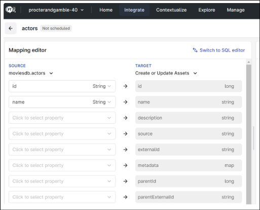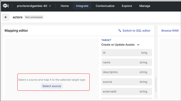 - ClickCreateto create the transformation. After you create a transformation, you need to select a source for data transformation.TheMapping editoris displayed. Mapping editor helps mapping source and target.Mapping Editor
