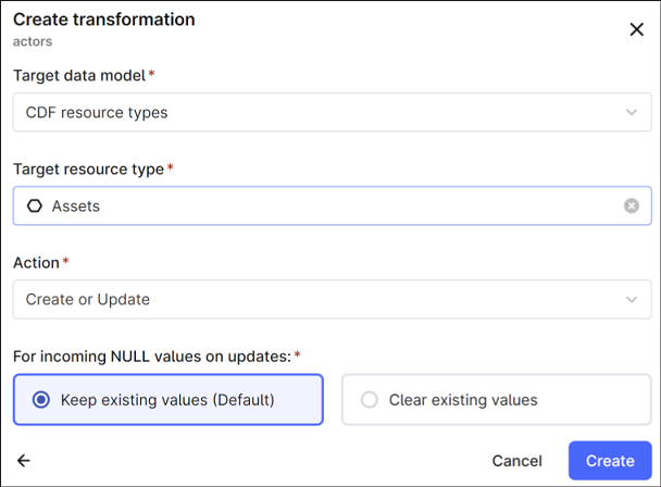 - In theActionlist, selectCreate or Update. If you are updating existing data, you must specify how the transformation should set null values.