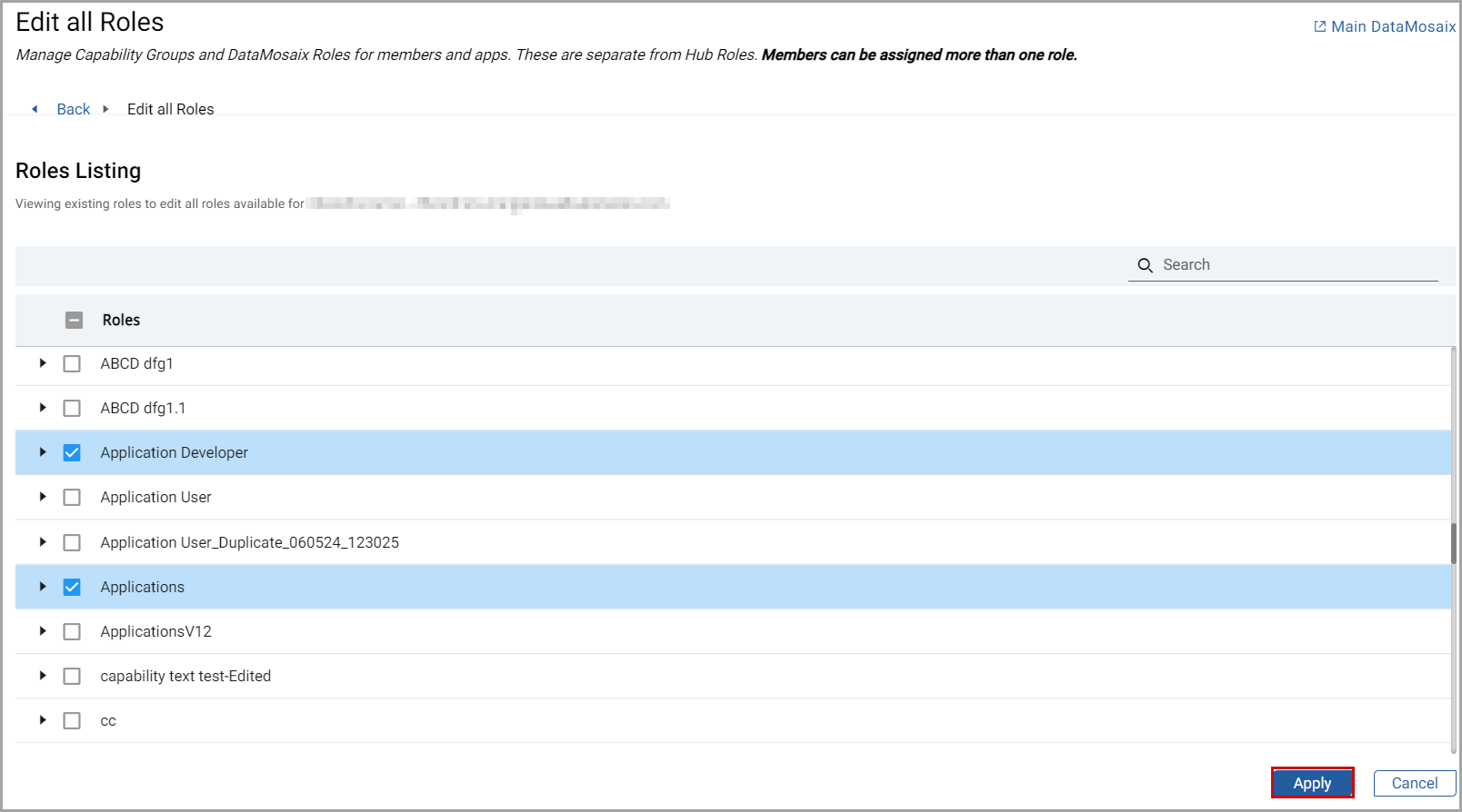 - After you make all the changes, clickApply.The "Roles updated" message is displayed.Edit Roles