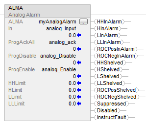 ProgAckAll | BOOL | Set to true by the user program to acknowledge all alarm conditions. Takes effect only if any alarm condition is unacknowledged. Requires a false-to-true transition. Default is false. Ladder Diagram: Copied from the instruction operand. Structured Text: Copied from the instruction operand. |