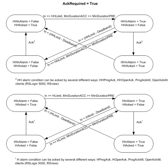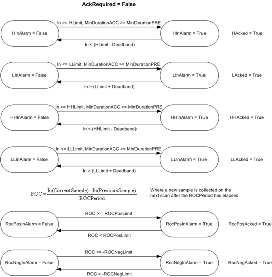 AckRequired | BOOL | Specifies whether alarm acknowledgment is required. When set to true, acknowledgment is required. When cleared to false, acknowledgment is not required and HHAcked, HAcked, LAcked, LLAcked, ROCPosAcked, and ROCNegAcked are always set to true Default is true. |