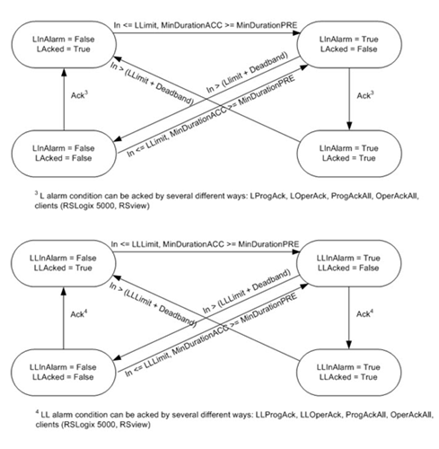 AlarmLimitsInv (Status.3) | BOOL | Alarm Limit configuration is invalid (for example, LLimit < LLLimit). If invalid, the instruction clears all level conditions active bits. Until the fault is cleared, no new level conditions can be detected. | ||||||||||||||||||||||||||||||