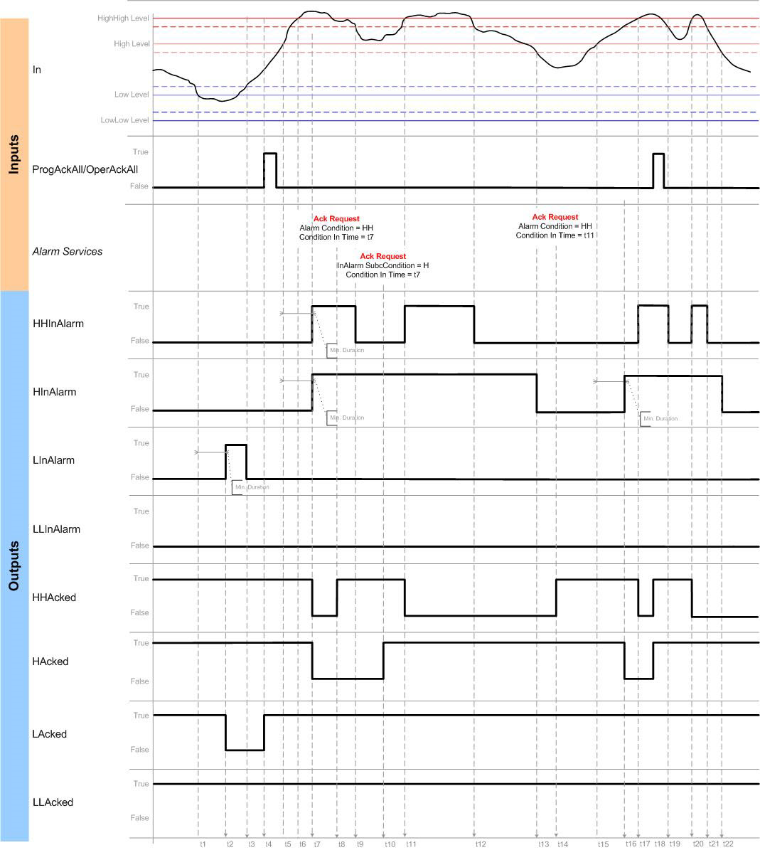 Deadband | REAL | Deadband for detecting that High High, High, Low, and Low Low alarm levels have returned to normal. A non-zero Deadband can reduce alarm condition chattering if the In value is continually changing but remaining near the level condition threshold. The Deadband value does not affect the transition to the InAlarm (active) state. Once a level condition is active, but before the condition returns to the inactive (normal) state, the In value must either: drop below the threshold minus the deadband (for High and High High conditions).