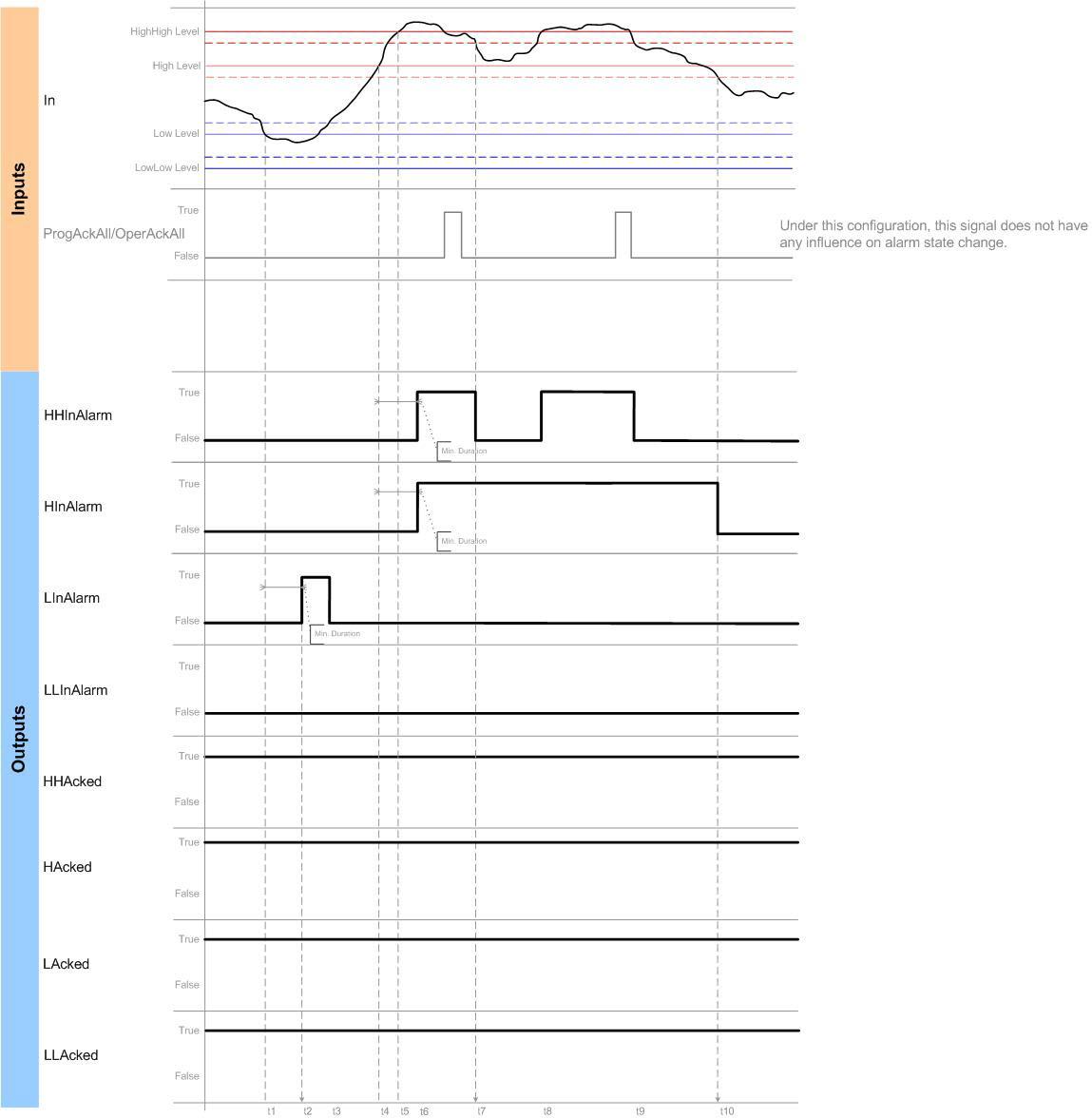 LProgAck | BOOL | Low program acknowledge. Set to true by the user program to acknowledge a Low condition. Takes effect only if the alarm condition is unacknowledged. Requires a false-to-true transition. Default is false. |
