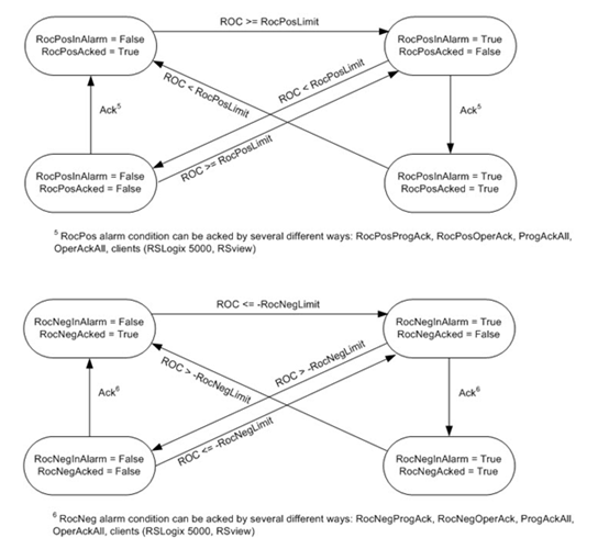 ROCPosProgAck | BOOL | Positive rate of change program acknowledge. Set to true by the user program to acknowledge a positive rate-of-change condition. Requires a false-to-true transition while the alarm condition is unacknowledged. Default is false. |