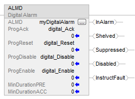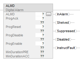 ProgDisable | BOOL | Set to true by the user program to disable the alarm. Default is false. Ladder Diagram: Copied from the instruction operand. Structured Text: Copied from the instruction operand. |