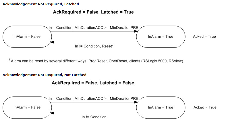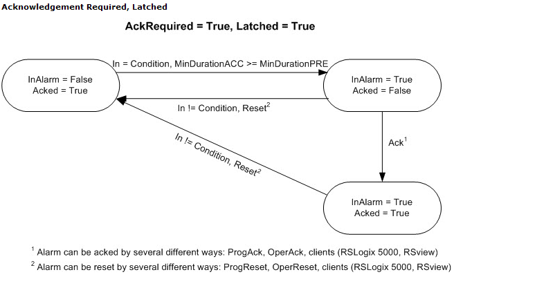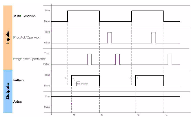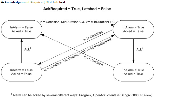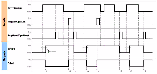 Immediate | On transition from false to true, acknowledges alarm (if acknowledgment is required). |