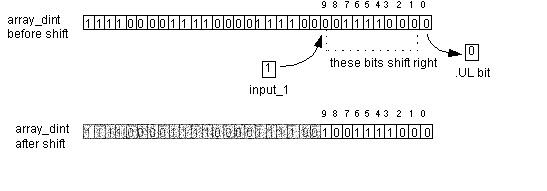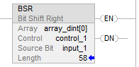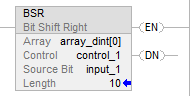 When enabled, the BSR instruction copies array_dint[0].0 to the .UL bit, shifts 0-9 to the right, and loads the input_1 into array_dint[1].25.. The remaining bits (31-26 in dint_array[1]) are invalid, which indicates that the bits may not be modified. Note how array_dint[1].0 shifts across words into array_dint[0].31.