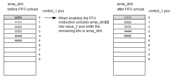 When enabled, the FFU instruction unloads data from the first element of the FIFO and places that value in the Destination. The instruction unloads one value each time the instruction is enabled, until the FIFO is empty. If the FIFO is empty, the FFU returns 0 to the Destination.