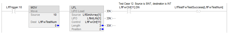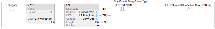 When enabled, the LFL instruction loads the Source value into the position in the LIFO identified by the .POS value. The instruction loads one value each time the instruction is enabled, until the LIFO is full.
